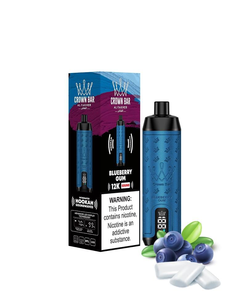 كراون بار الفاخر 12000 سحبة بلو بيري علكة Blueberry Gum يمزج بين الحلاوة الطازجة للتوت الأزرق مع نكهة العلكة الشهيرة. استمتع بنكهة التوت الأزرق الحلوة مع لمسة من العلكة عند الاستنشاق، وانفث في نكهة منعشة من النعناع التي تترك إحساساً مميزاً في الفم.