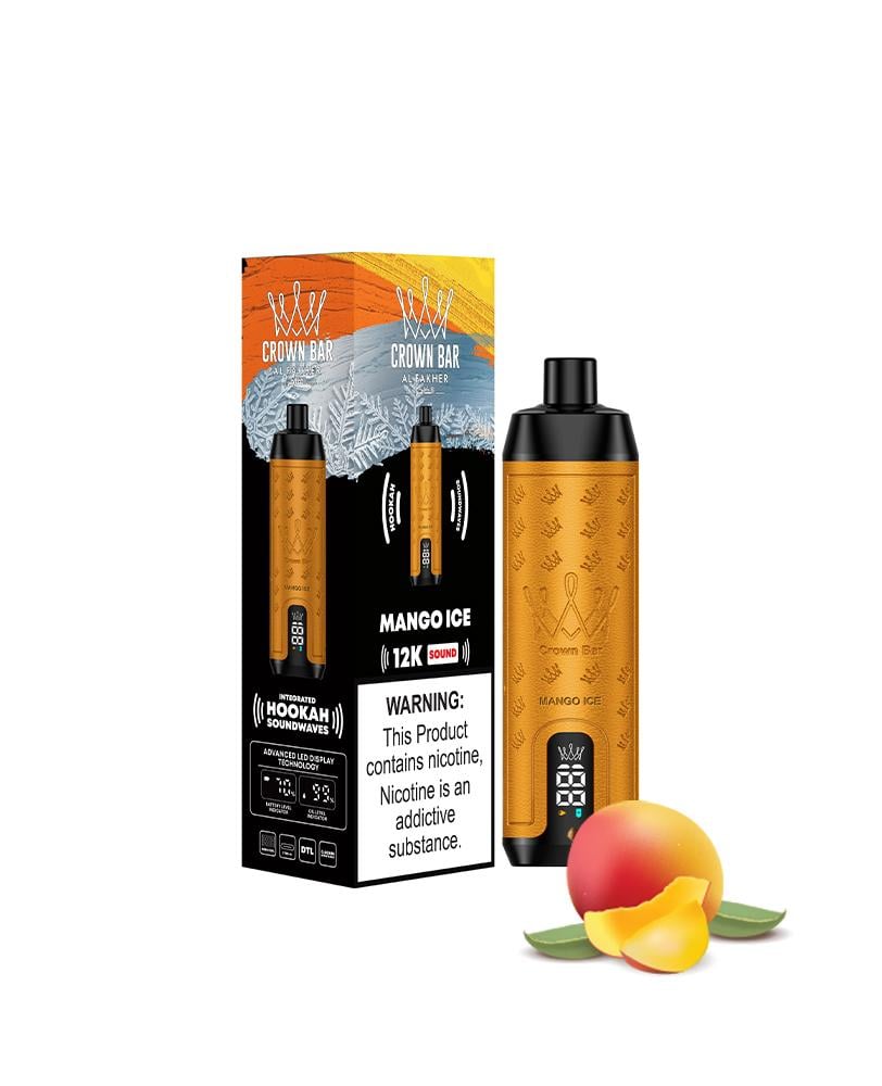 استمتع بنكهة المانجو الحلوة والمنتول المنعش مع كراون بار الفاخر 12000 سحبة مانجو آيس. تجربة تدخين استوائية ومنعشة!